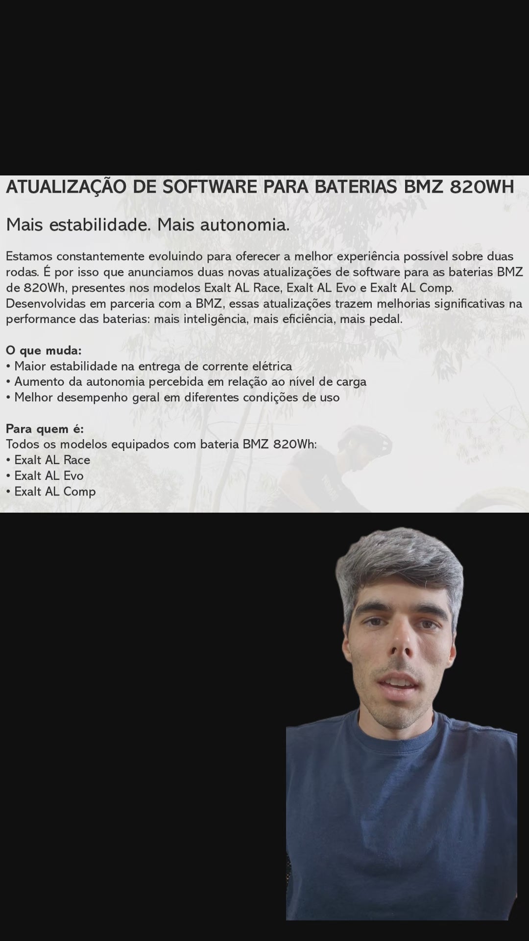 É por isso que anunciamos duas novas atualizações de firmware para as baterias BMZ de 820Wh, presentes nos modelos Exalt AL Race, Exalt AL Evo e Exalt AL Comp, incluindo as versões forty-5.